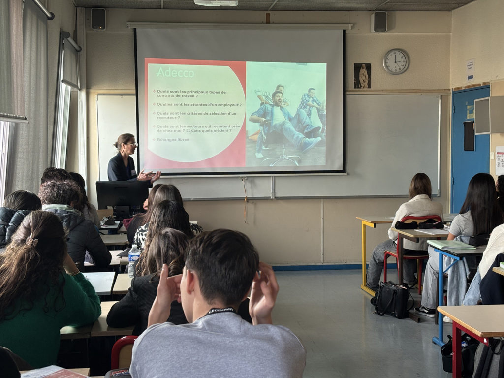 Ont ensuite été présentés les différents types de contrats de travail, en particulier le contrat de travail temporaire et la mise à disposition de salariés en intérim pour la réalisations de missions en entreprises. Souvent méconnu des jeunes, le travail intérimaire dont nos élèves ont découvert les spécificités, est un excellent tremplin vers un emploi pérenne pour celles et ceux qui n’envisagent pas d’études longues ou pour un premier poste à la fin de ses études.