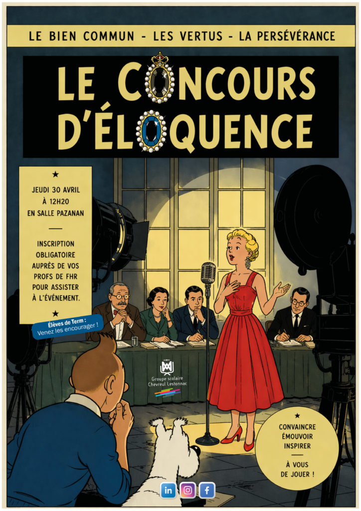 Le concours d’éloquence des élèves de Terminale du lycée Chevreul Lestonnac et du lycée Chevreul Saint Didier aura lieu le mardi 30 juin 2026 à 12h20 en salle Pazanan.