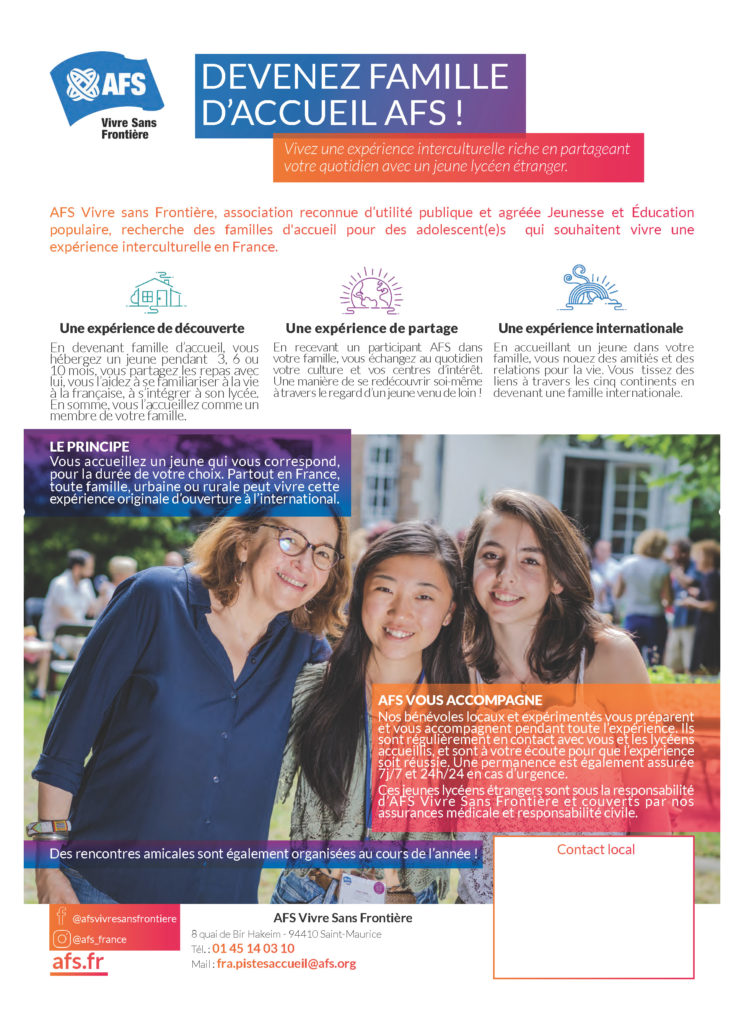 - Pour un accueil : Laetitia Paire (06 87 26 70 18), laetitia.paire@afs.org / Roxana Collet (07 87 56 57 06), roxana.collet@afs.org
