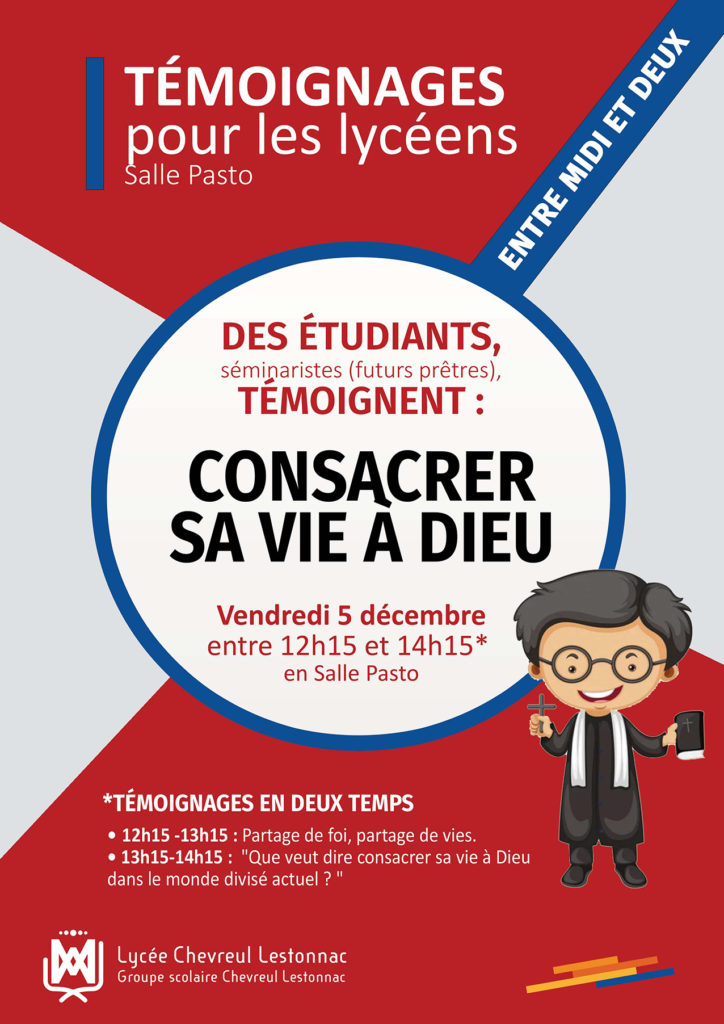 Vendredi 5 décembre 2025, dans le cadre de la Pastorale, les élèves qui le souhaitaient ont pu rencontrer deux jeunes séminaristes venus échanger sur le thème « Consacrer sa vie à Dieu dans le monde d’aujourd’hui ». Une douzaine d’élèves ont participé à cette rencontre.